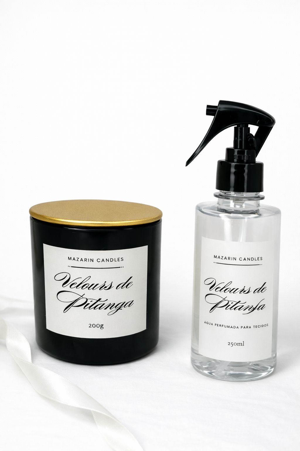 A coleção Velours de Pitanga combina uma vela decorativa em vidro preto com tampa dourada e uma água perfumada para tecidos, criando uma experiência elegante e acolhedora para o ambiente.