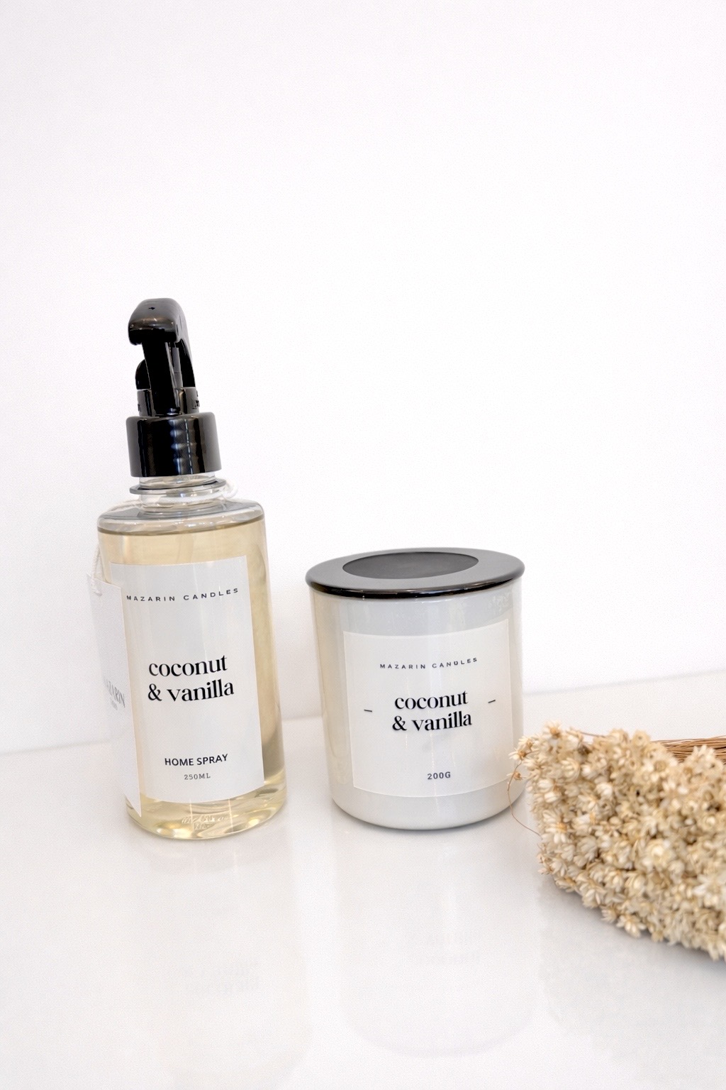 Kit com spray e vela perfumada para deixar seu ambiente sempre agradável com aroma de coco e baunilha.