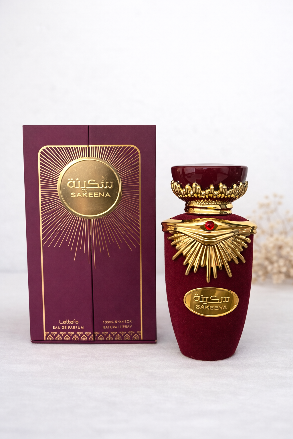O perfume Sekeena da Lataffa vem em um frasco de 100ml com acabamento em veludo vermelho, detalhes dourados e uma pedra vermelha na tampa. É um Eau de Parfum, portanto mais concentrado, o que proporciona maior fixação. Embalagem externa com visual premium que impressiona à primeira vista.