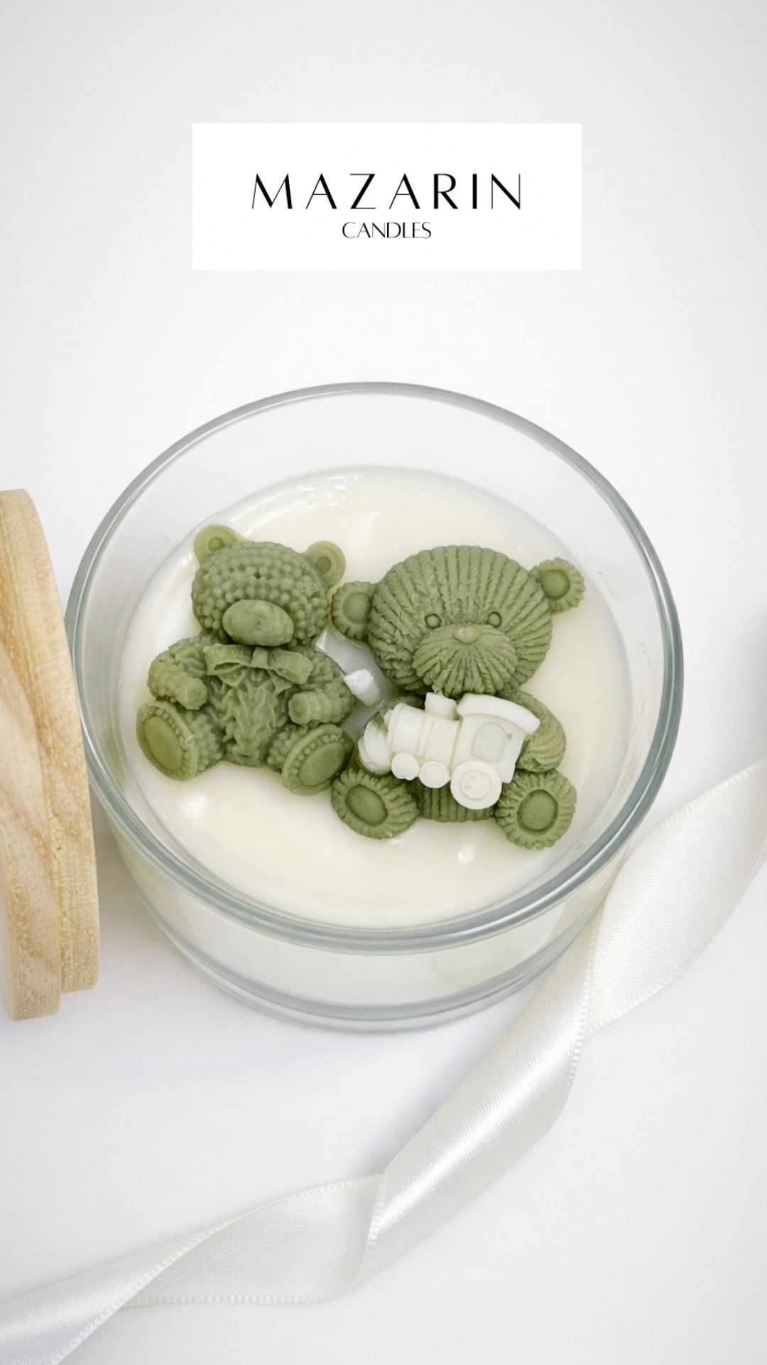 A vela vem em recipiente de vidro com tampa de madeira, permitindo reutilização do vidro após o uso. A peça possui detalhes finos em alto relevo no formato dos ursinhos, que ficam posicionados sobre a cera branca. O modelo tem aproximadamente 80 gramas, ideal para proporcionar algumas horas de queima com aroma suave.
